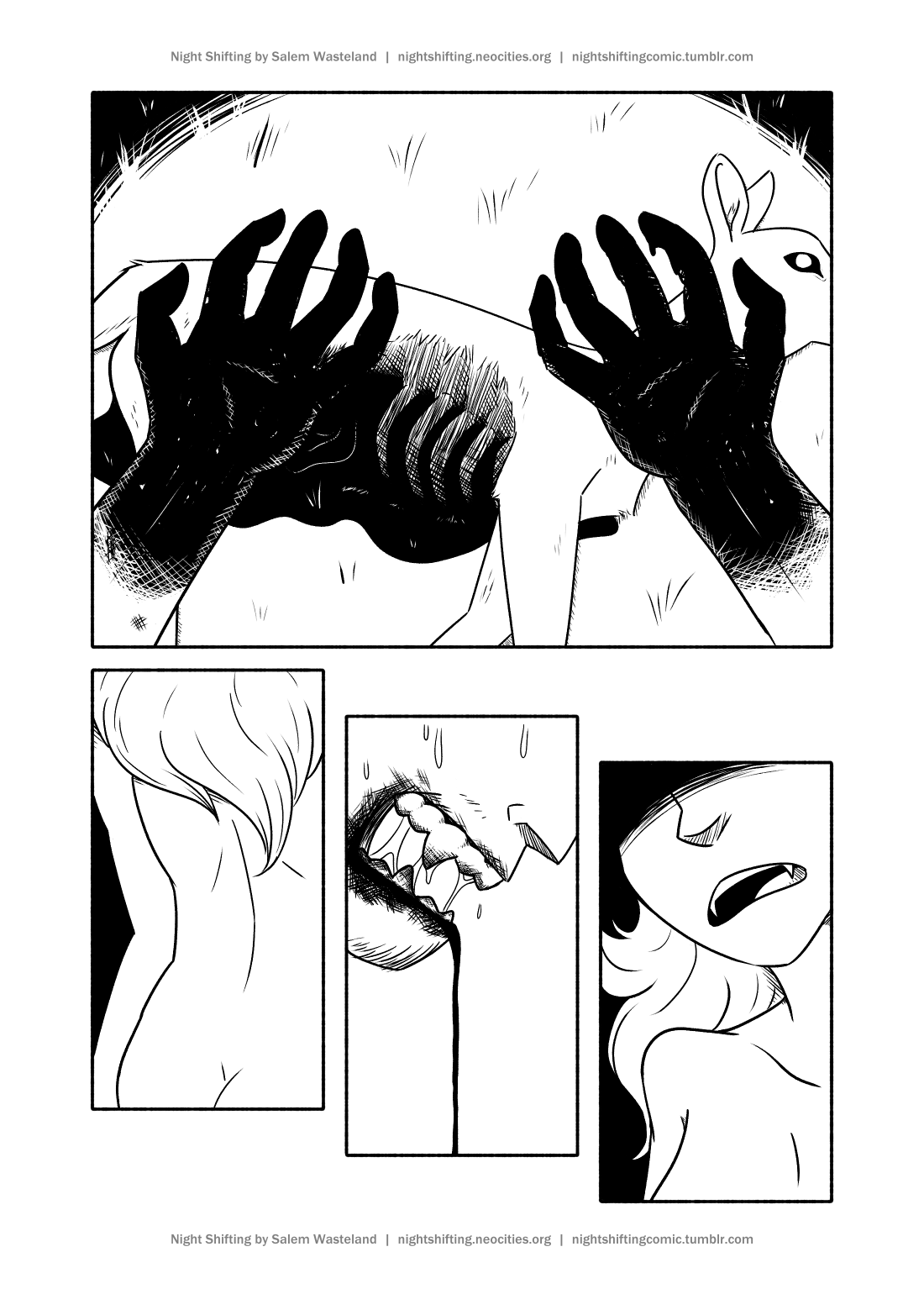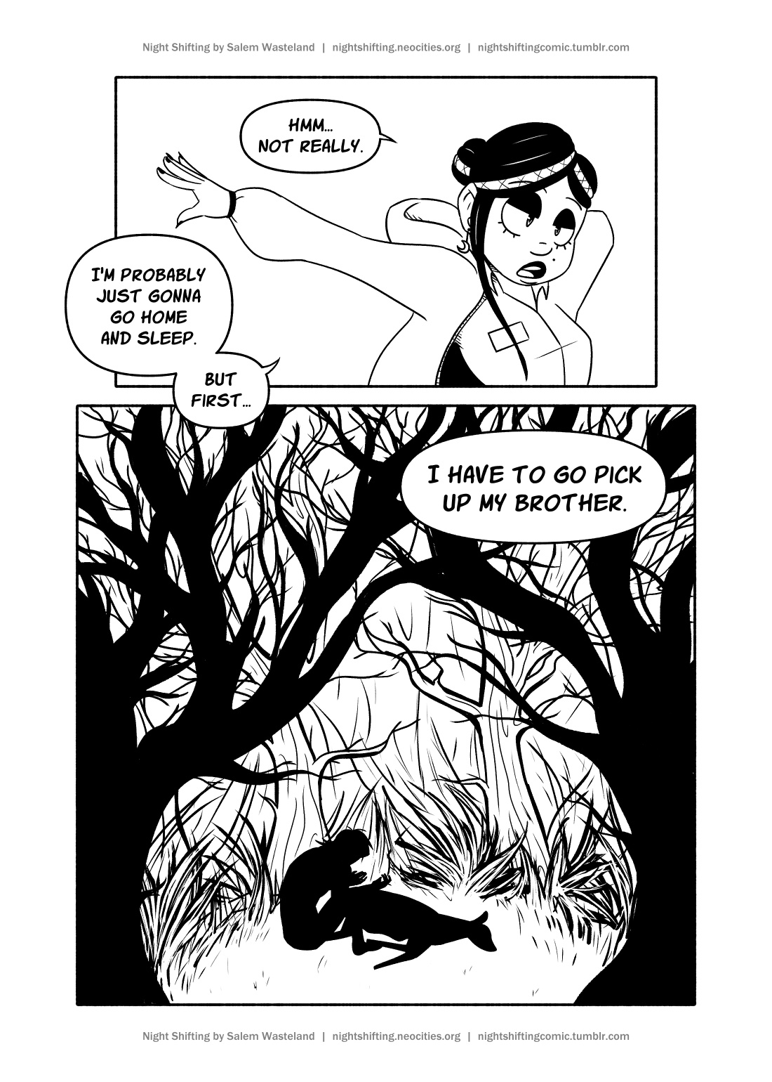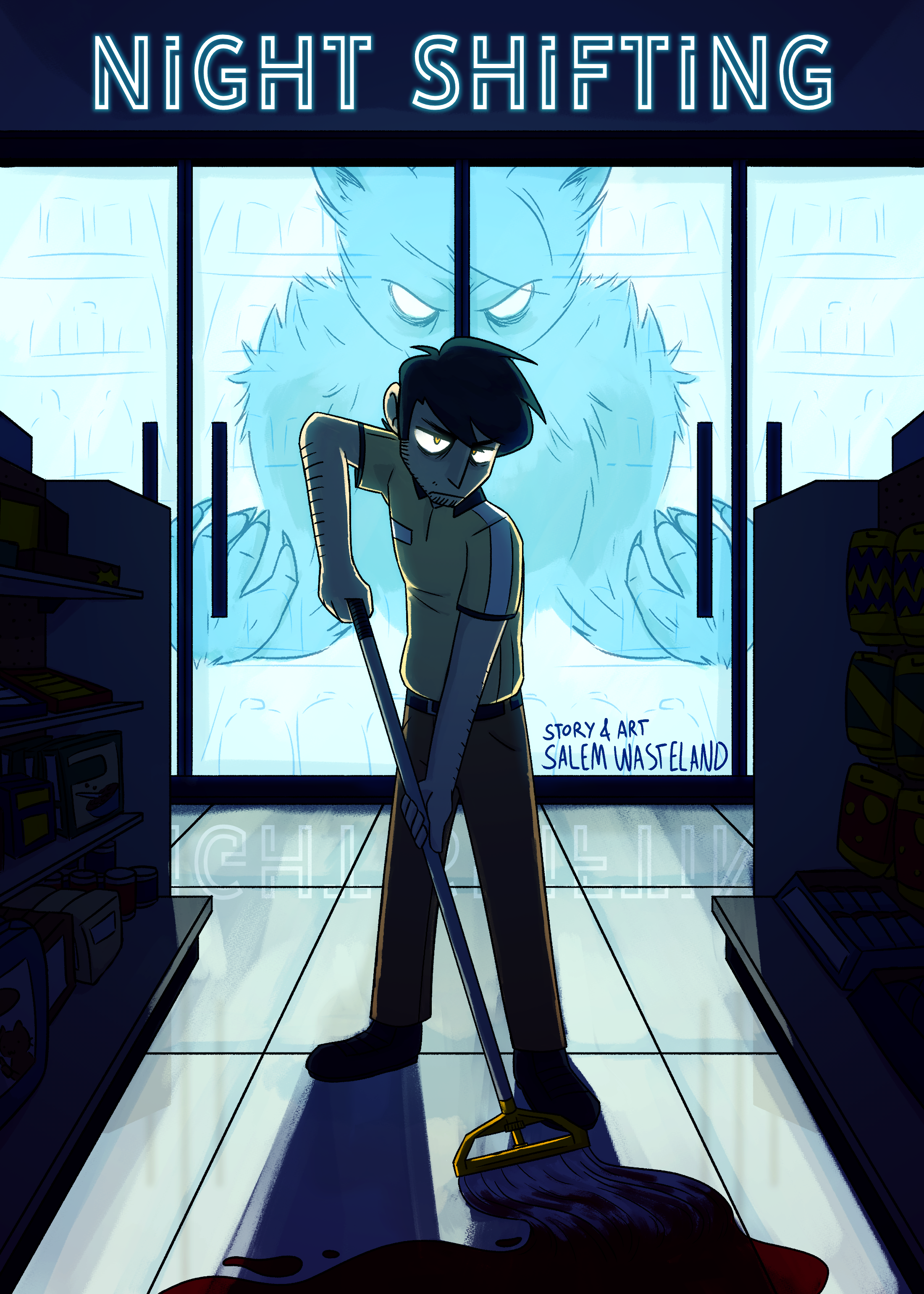 My "main" creative project that's gone from visual novel to webcomic and now back to visual novel. Here is some (but not nearly all) of the concept work I've done for Night Shifting, plus the first few pages of the comic.